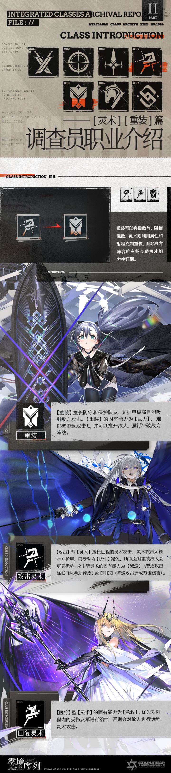 █ 调查团基础档案库 █ >>>文献检索 - 灵术、重装简介本页内容将继续帮助您了解麾下调查员的职业特点,请仔细阅读。重装调查员可以凭借强大的防御力保护队友、阻挡强敌。灵术职业存在图中所示的分支,并可利用属性和射程克制重装单位。面对敌方的阵容,唯有扬长避短才能在危机四伏的雾境中力挽狂澜。____________▶▶立即预约◀◀《雾境序列》复古未来幻想×即时战术SRPG ——以理智为灯