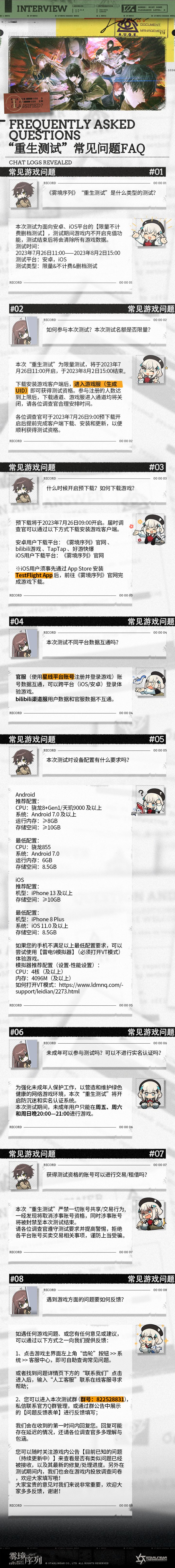 亲爱的调查官:《雾境序列》“重生测试”将于明日11:00正式开启!本次测试为面向安卓、iOS双平台的限量不计费删档测试,测试资格将通过限时抢注的方式获取,调查官在游戏开服后下载游戏并进入游戏服(生成UID)即可获取测试资格。为给调查官带来更好的体验,调查团已安排实习生阿莉雅,对本次“重生测试”可能出现的常见问题和解释说明进行了汇总,供各位调查官参考查阅。更多详情见下方长图~【测试详情】>