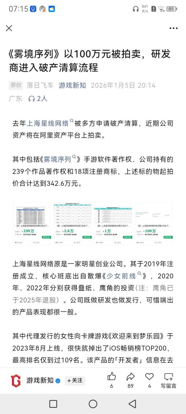 😲雾境:似了还能卖百万!由星线网络开发的手机游戏《雾境序列》,最近它又传来一个令人唏嘘的消息。据悉曾获得叠纸网络、鹰角网络投资的上海星线网络科技有限公司,目前已进入破产清算程序,其核心资产《雾境序列》及相关权利,在近期被以100万元的起拍价挂牌拍卖😲昔日明星二游太落魄记得《雾境序列》这款二次元即时战术手游,当初凭借不错的美术风格、借鉴来的优秀的玩法基础,在测试阶段吸引了不少目光,团队核心成