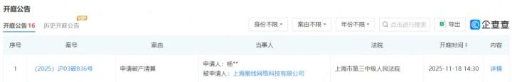 11月18日,据企查查平台与上海市第三中级人民法院官网发布的信息显示,上海星线网络科技有限公司破产清算一案在线上召开了债权人会议。该事件预示星线网络正式开启破产清算,该公司正式破产。星线网络成立于2019年,其创业班底主要出自散爆网络,有知名负责人焦扶摇、美术总监白书林(白龙)、文案组长热运动和主美音符(infukun)等。后续因游戏言论问题,部分核心人员离职,游戏讨论度跌至低点,缺乏二游影响