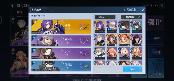 今天浅谈一下幻灵编队分析之暗影篇。在这个组合中,我选择的附体是人气非常高的小影,小影的技能拥有百分之200%的角色攻击力加成并附有惊惧效果,是中期暗影套的输出担当。由于我用暗影相比于其他属性要少一些,其他的三个分别是:西珀尔、芒色还有马德兰。虽然只有小影一张橙卡但是两张紫卡也能保证一定的强度,并且暗影套的控制技能较多,还有一定的AOE伤害,前中期刷本还是没问题的。但是这套组合也有一个弊端就是队中四