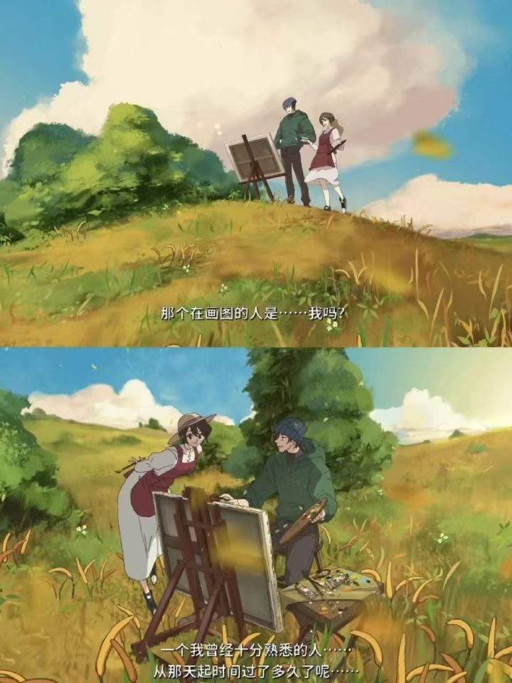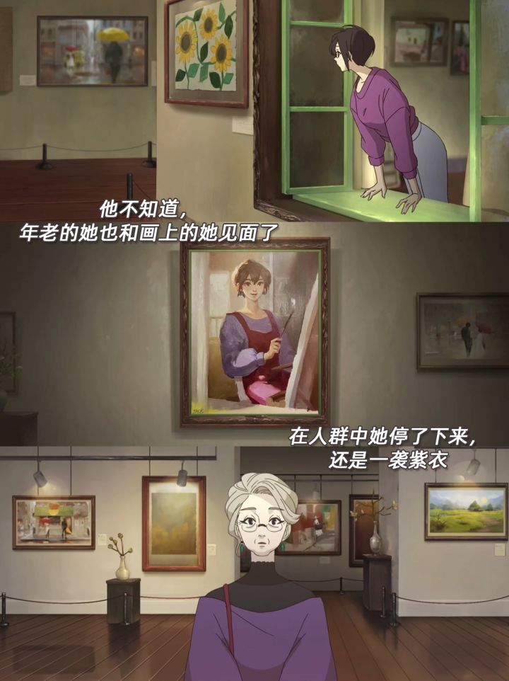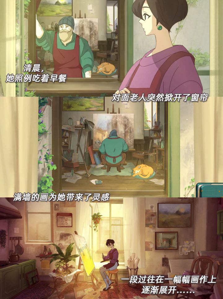 艺术,是人心和感情的载体。即使岁月变迁,创作的画师早已作古,但画师的画作仍然年轻。艺术距离神越来越远,却与人越来越近了。倾听画语,以细腻温柔的笔触,将我们带入了情感浸润的世界,那里的每幅画都是情感的载体,是记忆的碎片,是心灵的不语。只是个寻常的清晨,阳光透过窗户,洒在年轻画家的画布上。她正沉浸在创作的喜悦中,用画笔捕捉着美好。这份平静并非孤立无援,对面窗台上沉默的老人,以同样执着的姿态,绘制着