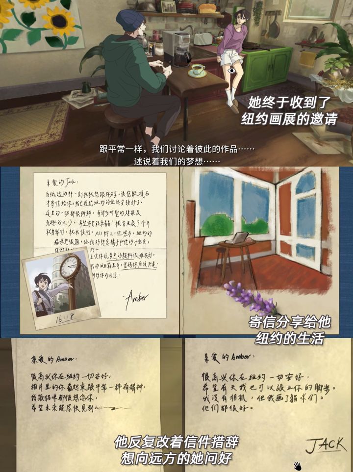 花了一个多小时把游戏通关通关后感觉到了前所未有的平静,然后发现还有DLC那条线,做完之后有一种说不清的难过萦绕在心头“有时就是因为缺憾,而让那些回忆美好无比…”“爱是想触碰又收回的手”Jack两次回信都改用更克制积极的语言,尽管他爱着Amber,但他只在Amber离开时,对她说“恭喜”…·他有自己的追求,以绘画为一生的目标。并不会为了Amber而放弃自己的坚持。在Amber邀请他去参加