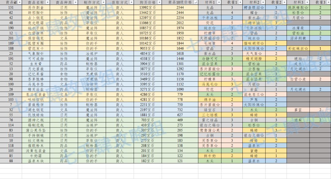 发布日期:2022-08-23 更新时间:2022-09-07 对应版本:V1.0.5 目前共有商人配方31个 商人配方汇总图 例: 注意事项: 配方不同颜色代表配方等级; 材料不同颜色代表材料获取方式; 材料带☆表明该材料种子从商人处获得; 商人配方无法在未获取配方情况下研发; 商品10级价格为初始价格2倍左右; 不建议前期购买商人配方(除了生发膏,及香茅脆棒!) 该表格以10级出售价格降序排序