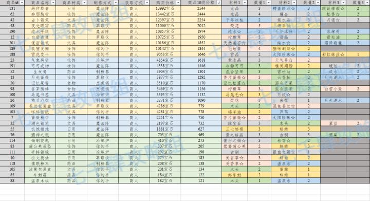 发布日期:2022-08-23更新时间:2022-09-07对应版本:V1.0.5目前共有商人配方31个商人配方汇总图例:注意事项:配方不同颜色代表配方等级;材料不同颜色代表材料获取方式;材料带☆表明该材料种子从商人处获得;商人配方无法在未获取配方情况下研发;商品10级价格为初始价格2倍左右;不建议前期购买商人配方(除了生发膏,及香茅脆棒!)该表格以10级出售价格降序排序