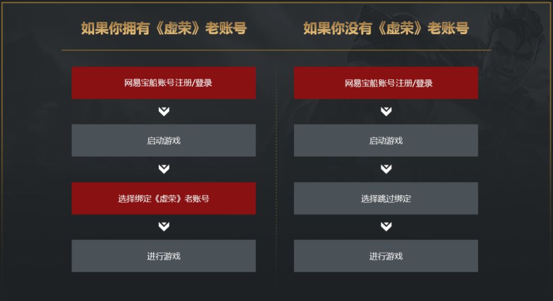 为保障账户安全和提供更好的服务,《虚荣》已在PC版率先推出全新的账号绑定功能。随着4.4版本的发布,我们在《虚荣》的安卓(非手机应用市场版本)客户端中进行了账号安全绑定功能的升级。 账号升级方式 《虚荣》安卓账号升级须知: ● 从4.4版本开始,进入《虚荣》安卓(非手机应用市场版本)客户端时,您需要使用网易宝船账号进入游戏,如果您还没有网易宝船账号,请先注册一个。 特别提醒: 1. 如果您已在PC