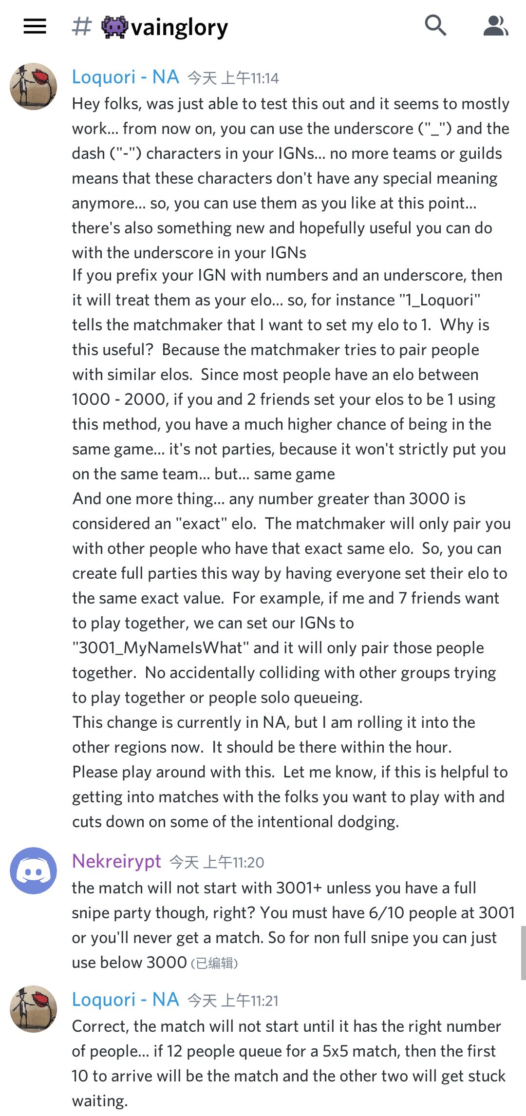 开发者Loquori今天已对比赛匹配进行调整,通过在ID前面加同样的数字前缀加大匹配到同一局的几率,是否在一边还是随机的 ID示例:数字+下划符号“_”或英文破折号“-”+ID,如50_Vainglory,6000-Vainglory ★说明: ①4个人(33)或者6个人(55)及以上用大于3000的数字前缀,会匹配到没有路人的同一局;不够这么多人用3000以下的数字前缀,会匹配到路人 ②基于el