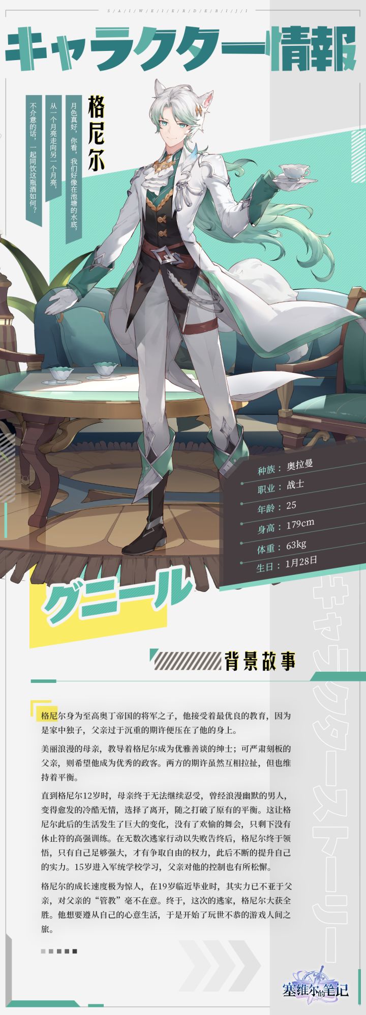 「月色真好,你看,我们好像在池塘的水底,从一个月亮走向另一个月亮,不介意的话,一起同饮这瓶酒如何?」-----------------------------------【基本信息】姓名:格尼尔种族:奥拉曼职业:战士年龄:25身高:179cm体重:63kg生日:1月28日喜欢:文学读物;参加酒会;美丽的事物。讨厌:有瑕疵的东西;无脊椎动物。-----------------