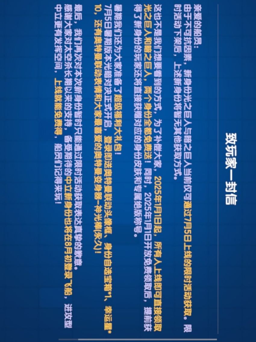 #嘿嘿太空杀 #太空杀联动 #太空杀 #快乐太空杀 #太空杀奥特曼新身份 #太空杀身份觉醒 还记得24的7月5号那天吗,奥特曼联动正式在那天登陆太空,光之巨人、暗之巨人因不可抗力的因素只能通过氪金获得,也是非常的贵。并且官方还在公告中承诺了25年的1月1日起光暗巨人两身份免费送,好消息归好消息,坏消息也有!记得在16天之内领取完,否则该活动会被下架哟,下架之后就不能免费领!已经解锁了的会送绝版装扮