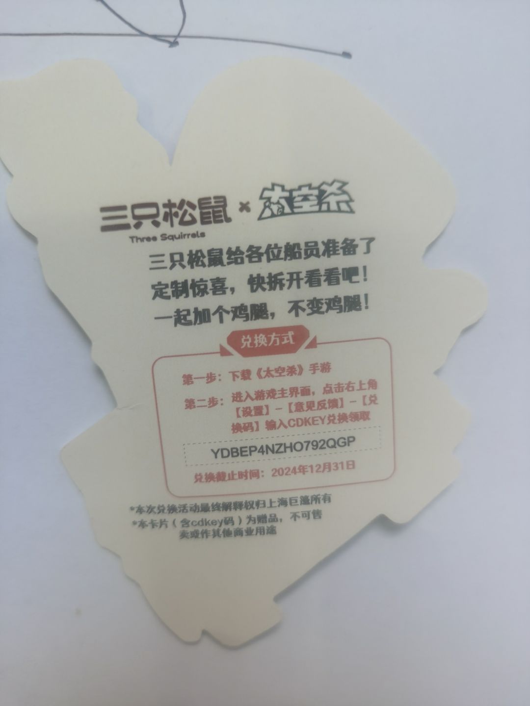 就是买了个鸡腿,然后他送了一个这个兑换码,如果你玩这游戏,你自己兑换一下就行了,我也就当个好人送送了,反正我自己也不需要(* ̄m ̄)就一张新,如果拿的话,就评论区说一下,算了算了,感谢不感谢都无所谓(≧∇≦)