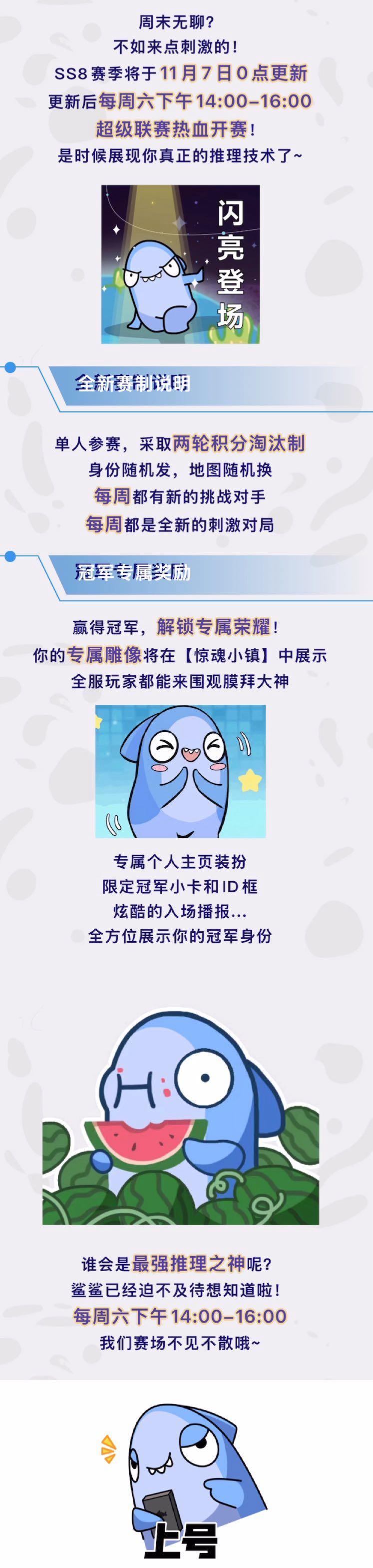 太空杀-超级联赛正式启动! 赛事将于SS8赛季更新后,每周六下午14:00-16:00准时开启。 比赛为单人参赛模式,采取两轮积分淘汰制,竞技节奏更快更刺激。 对局中身份随机分配,地图随机轮换,极致考验策略与实力。 夺得冠军后,专属雕像将在【惊魂小镇】公共地图中展示。 同时,冠军荣誉还将通过个人主页、小卡、局内ID框及入场播报全方位彰显。 每周六下午14:00-16:00,期待您在太空杀超级联赛中