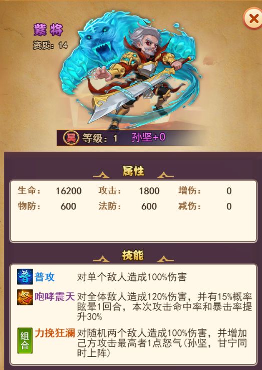 普通攻击:对单个敌人造成伤害怒气攻击:“帝骖龙翔”对单个敌人造成伤害,50%几率恢复自身4点怒气,并提高自身20%攻击持续2回合组合技:“紫色东来”与姜维同时上场,对随机三个敌人造成伤害,并有80%几率恢复自身2点怒气与对应的缘分武将同时上场,将可获得相应的属性加成