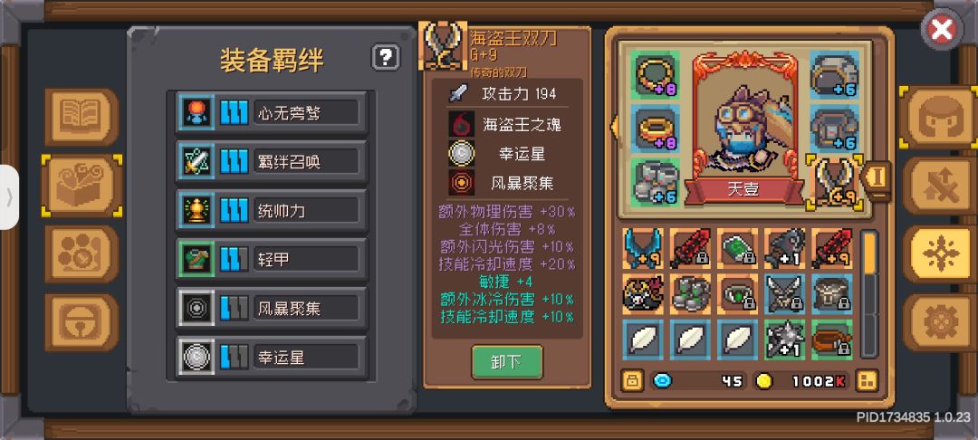三统帅三羁绊三田螺三重甲三冷却,不吃雕像,武器药水猴了一下,大概是这个情况。召唤强度才380,其实大剑还有个1.67的没截图。。在此基础上还想提升伤害的话,一开始我打算把田螺套换哥布林套的心无旁骛,但脑测了一通又尝试了一下发现好像野猪王套加成更多。野猪王之魂在忍者的吸血光环和超额召唤的情况下可以常驻,全力突进的加成在忍者冲刺后也可以吃到加成。。。问题就是害得刷一套野猪王且带羁绊或者召唤词条的力量重