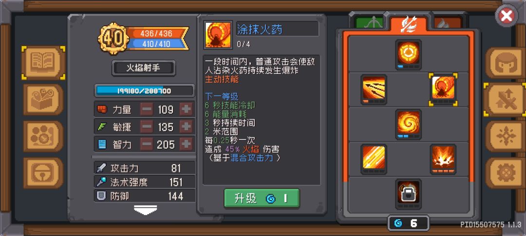 火焰射手的帖子很少,就兴起玩起来看看职业特性,还真是弓箭打起来清图慢伤害很刮痧,等级低装备不够好? 也许是吧.之前玩过陨石法师.就用同样的思路带起来看看,于是放弃弓箭拿上书本 嘎嘎乱炸 技能方面 火球满-堆火苗神技 火山满-主要是推图配合引爆清小怪 引爆-核心输出 单一个火苗就700%... 羁绊-扩散>分裂 吸蓝凑个2 有点缺蓝 吸血不用刻意强求,第四个技能位放个血瓶 血瓶完了 还没完 那 装备