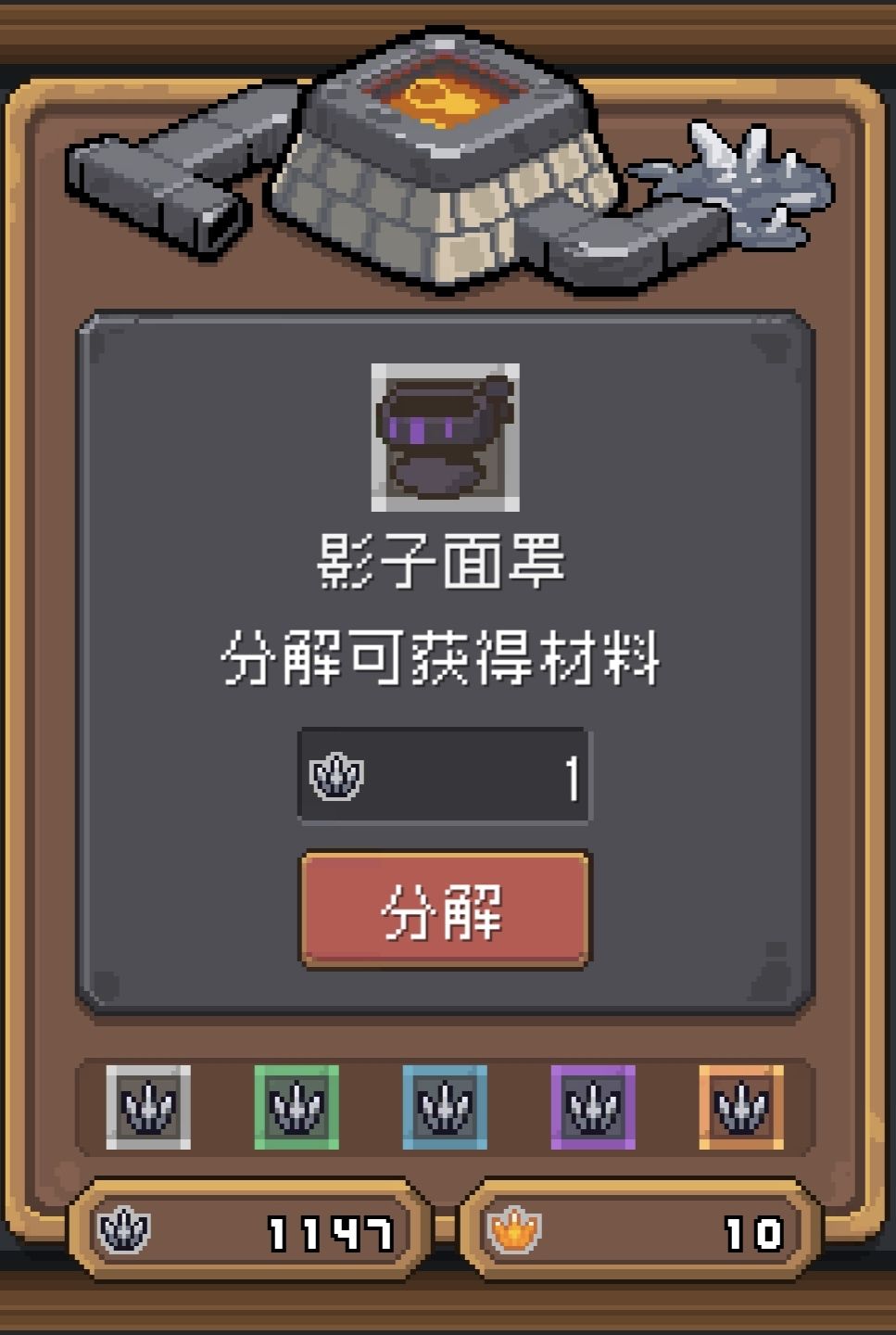 第一次做攻略,如有错误,还请多多包涵,欢迎指正! 一.装备的分解 (1)装备的分解碎片由装备颜色以及后缀字母决定。 (2)同字母装备(除金装)都仅仅增加碎片数量。 (3)目前装备等级不影响分解碎片数量。 (4)一共有7种碎片: 如图: 除金装外,没有字母后缀的装备由白到金的白边碎片依次为1-5,金装额外加一个白边金碎片。 除金装外,有M字母后缀的装备由白到金的绿边碎片依次为1-5,M后缀的金装额外