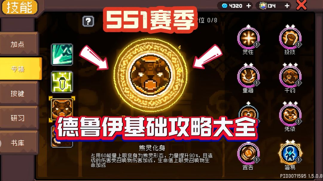 德鲁伊作为SS2赛季的热门职业之一,曾拥有人手千层随便万亿的存在,即使本赛季被削了也依然阻止不了他的强势。接下来我将为大家带来德鲁伊最详细的攻略 注:以下仅为个人观点 一.技能加点 通灵师:聚灵术点3级(开专精)、号召光环点满(提升攻击速度、提升技能冷却)、灵能同步点1级(配合熊灵化身专精)、灵体过载(增加能量值上限) 德鲁伊:熊灵化身点满(大幅度获得力量)、强韧(受伤时获得临时的生命值)、狂