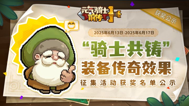 公示已结束,恭喜在“骑士共铸”装备传奇效果征集活动中获奖的小骑士!请各位获奖的小骑士添加中奖Q群:960274152并填写群内公告问卷登记相关信息哦,截止2025年7月6日23:59:59,逾期未进群登记信息的小骑士视作放弃获奖资格~亲爱的小骑士们:感谢大家积极参与本次装备传奇效果的征集活动!大家非常热情,我们收到了很多富有想象力和创造力的投稿,从这些投稿作品中能够感受到小骑士们的智慧和热