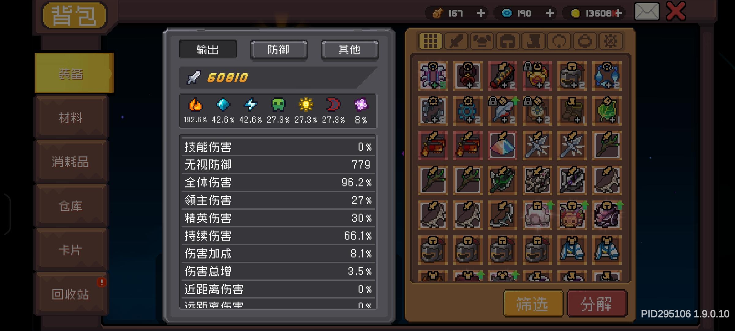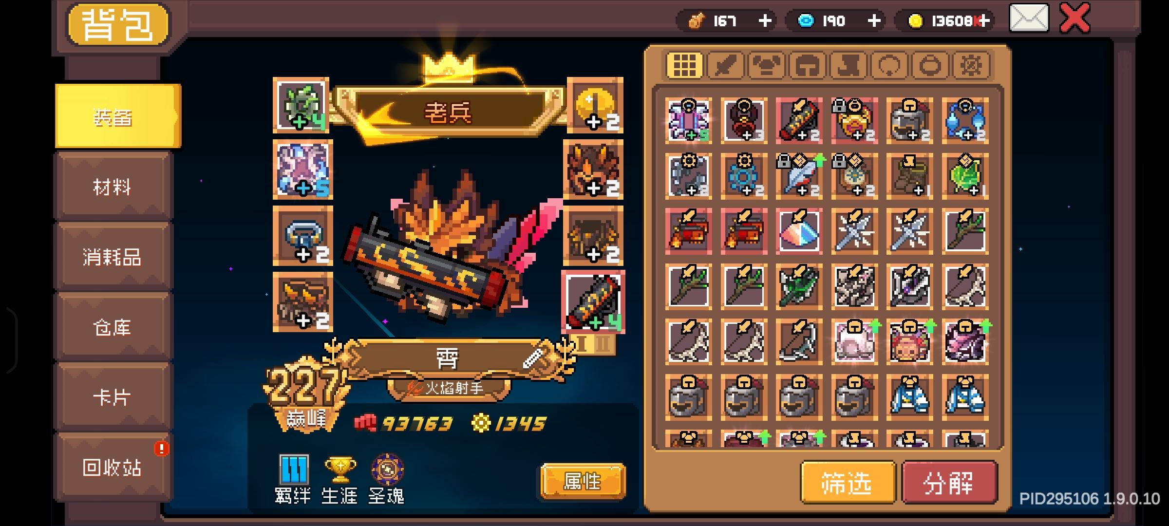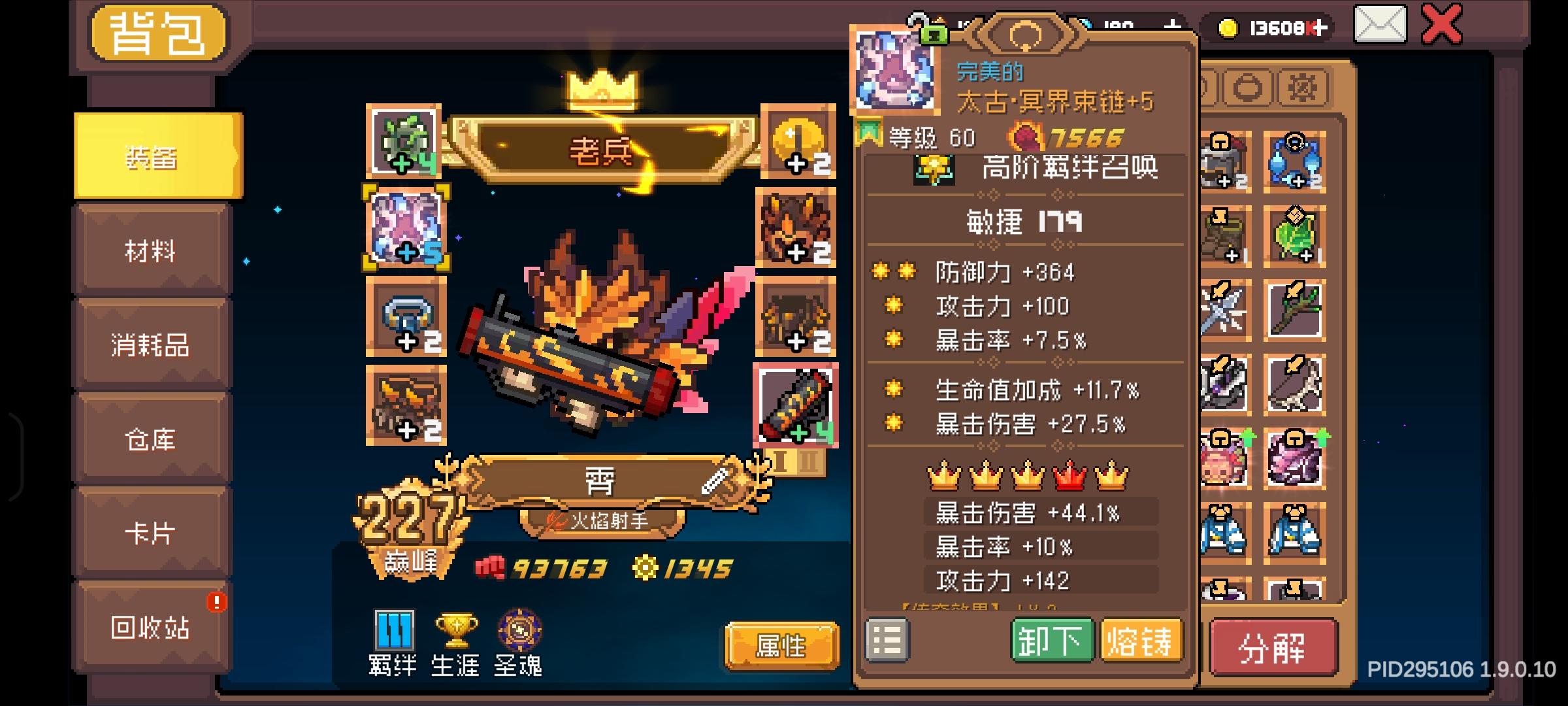 装备上,劫火和负咒无需多言,英灵项链提供稳定回蓝,时停和跑鞋提供大量移速加成,雪猿王戒指用来触发元素精通,提供大量元素伤害 羁绊上带扩散,配合红武大范围挂焦化,带连击增加攻速提升手感,带智能施法解放双手,带一个弹射用来更好的打群怪,剩下几个羁绊无需多言,反正就是提升伤害用的 火药的技能释放频率很快,所以带尘世用来提高技能伤害,火焰披风用来挂燃火,配合劫火头盔提升伤害,仙人吊坠和狗牙是提升数值用