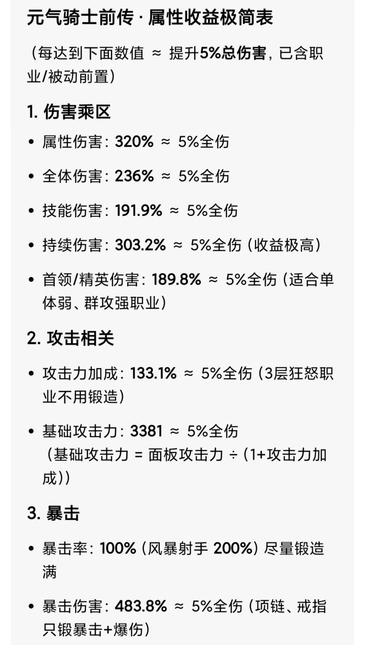 装备锻造属性: 齿轮——缺啥补啥 核心——攻击力加成 项链,戒指——暴击伤害 头盔——无视防御 鞋子——领主伤害 护甲看装备需求,没有就选主属性 武器看职业,在排行榜上照抄 由于资源限制和版本更迭,正常情况下是达不到最优解,所以只要记得除了爆伤其他属性在200%左右即可 ————————————以上内容均在ss6赛季排行榜,攻略,实战得出引用了以下文献: