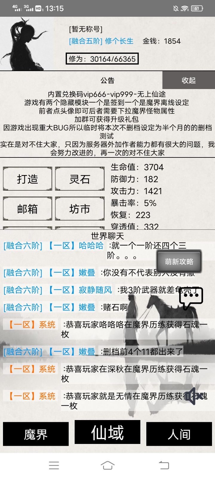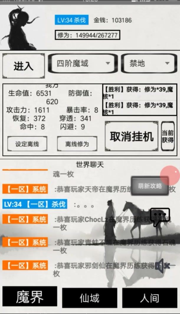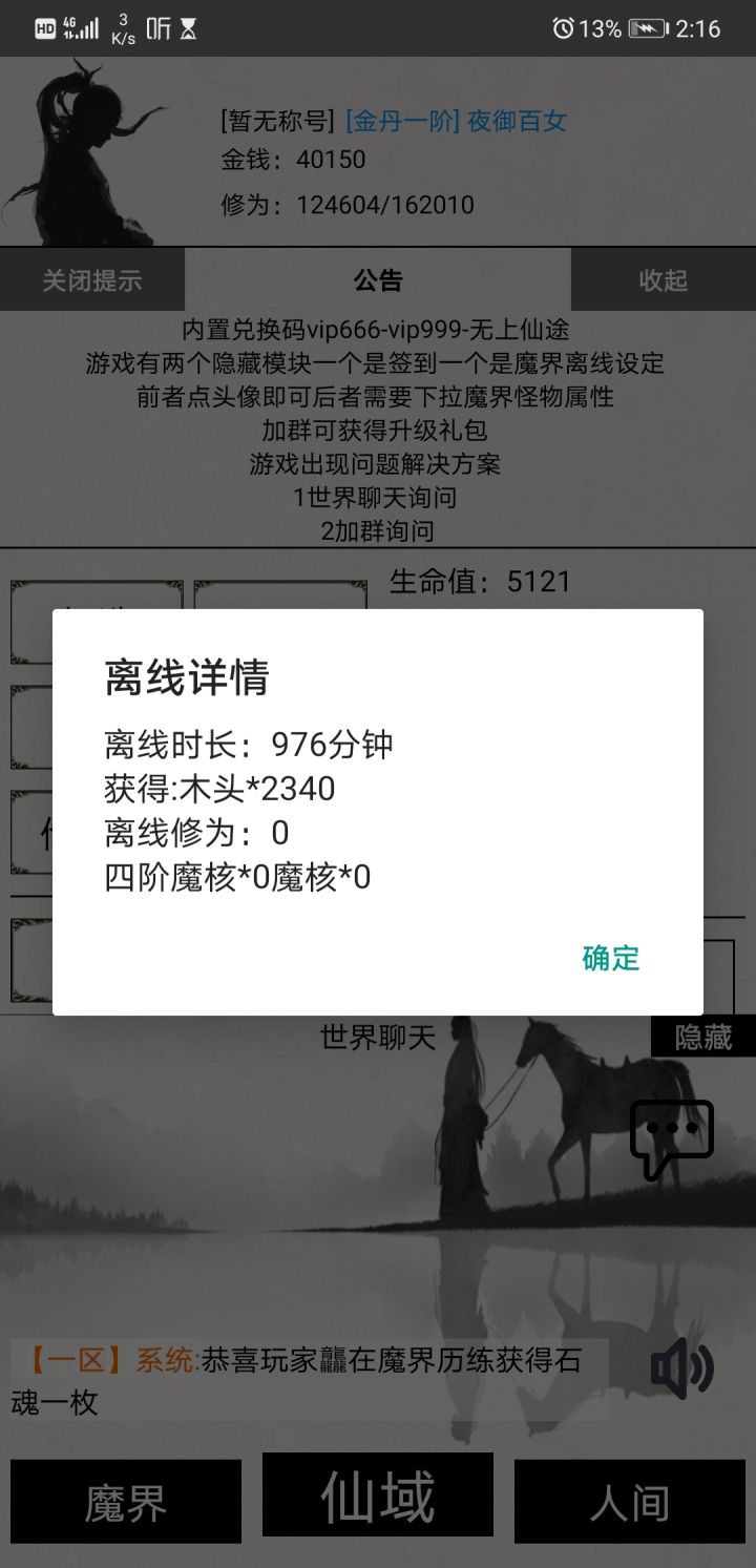 离线收益除了魔界的收益,人间收益完全看运气,对了离线挂机没有 石魂 提升战力的好东西灵石,是拿石魂合成的打造里面有,还有打龙看广告和多人副本,上古遗迹都是有几率出石魂的,石魂这个东西只有在线挂机才能爆,离线是不会爆的