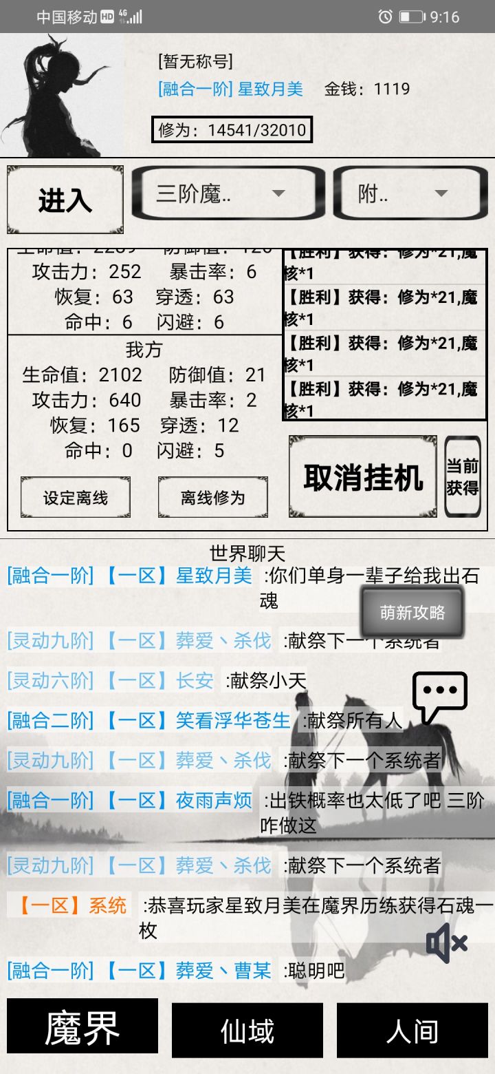 离线收益除了魔界的收益,人间收益完全看运气,对了离线挂机没有 石魂 提升战力的好东西灵石,是拿石魂合成的打造里面有,还有打龙看广告和多人副本,上古遗迹都是有几率出石魂的,石魂这个东西只有在线挂机才能爆,离线是不会爆的