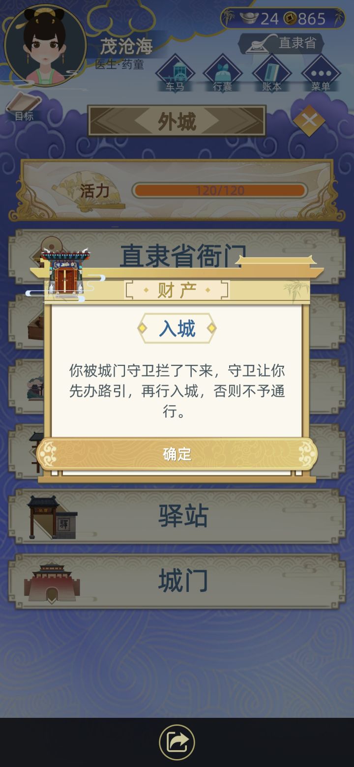 八岁的时候考试入宫,结果一年就被赶出来了,孤身一人呆在直隶,本来就想出外城看看,结果忘记我不是直隶本地户口了,而且我还没有路引,身上只有20几两银子,彻底是回不去了#这算不算游戏bug