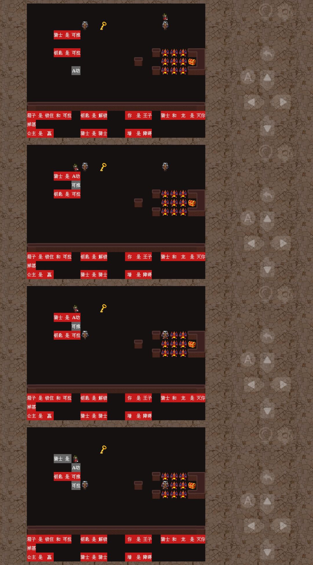 第89关 1、按图1所示 把一个【骑士】推至第一列【恶魔】上面,面朝下。 再组成“骑士是A动”,点A动 直到【骑士】走到第一行【恶魔】位置,破坏“骑士是A动” 2、按图2所示,组成“骑士是可拉”,并拉至图示位置,面朝左。 3、按图3所示,组成“骑士是A动”,点击A动,直到【骑士】把【宝破坏箱】拉出来,且位置重叠,破坏“骑士是A动”。 4、同样的方法,将【钥匙】弄到【宝箱】位置,掉落【公主】,触碰【