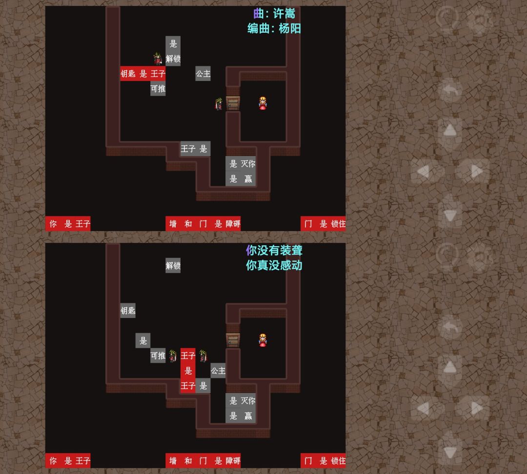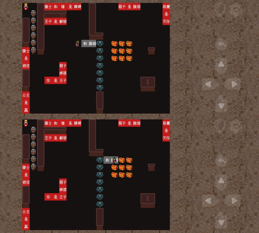 第74关 解法一 按图1所示,推动文字组成“墙是障碍和可推”,如此便可推开【墙】,触碰【公主】,即可过关。 解法二 按图2所示,推动文字组成“墙是障碍和公主”,如此【墙】就会变成【公主】,触碰【公主】,即可过关。