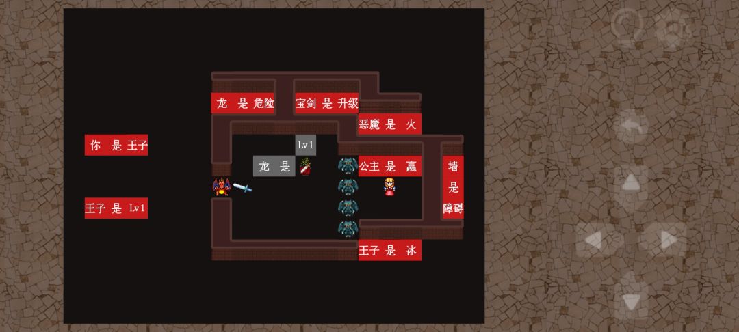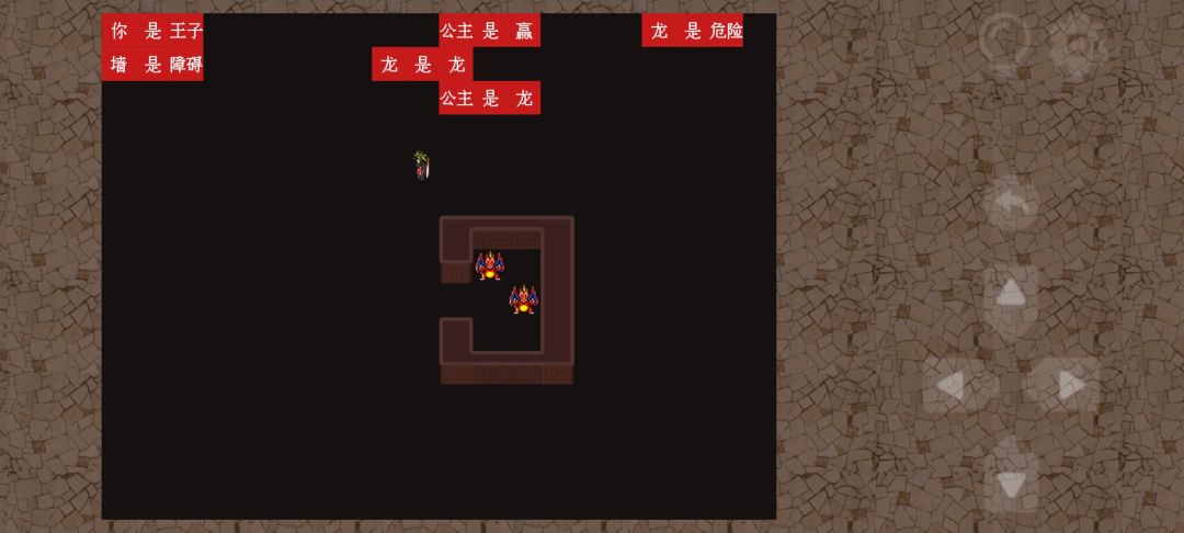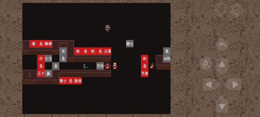 第75关 操控【王子】走到图1所示位置,一直向左推,直到组成“公主是赢”,然后一直向右走,即可过关。 ❶只要破坏掉“蛇是可推”,那么便可以当【蛇】 不存在,也不会存在“龙是灭你”。 ❷所以只需要中毒后不会空走5步就行 ,随便 再找一个以上的文字推着向左即可