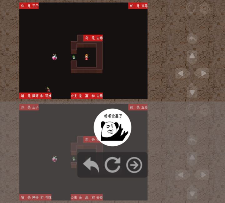 第74关解法一按图1所示,推动文字组成“墙是障碍和可推”,如此便可推开【墙】,触碰【公主】,即可过关。解法二按图2所示,推动文字组成“墙是障碍和公主”,如此【墙】就会变成【公主】,触碰【公主】,即可过关。