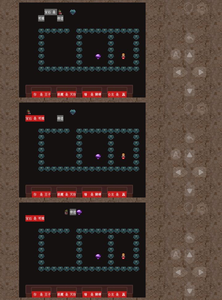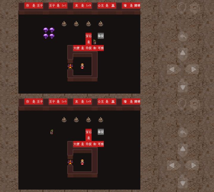 第61关1、如图一所示,把“宝石是降级”的“是”,组成“宝石是升级”,然后吃掉4颗宝石升到5级。2、如图二所示,把“宝石”推动组成“大便是升级和宝石”,就可以把【大便】变成【宝石】。3、按图三所示,然后再重新组成“宝石是升级” ,吃掉4颗宝石升到9级。和【龙】平级,便可以通过【龙】触碰【公主】过关。
