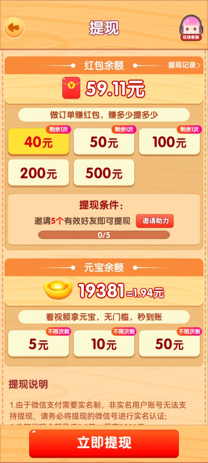 第十天,是的,我坚持到了10天,存了将近100的奖励金,然后准备提现40块的,要求拉5个人助力,不然就只能提现5毛钱,是的,你没听错,40块变成了5毛钱。