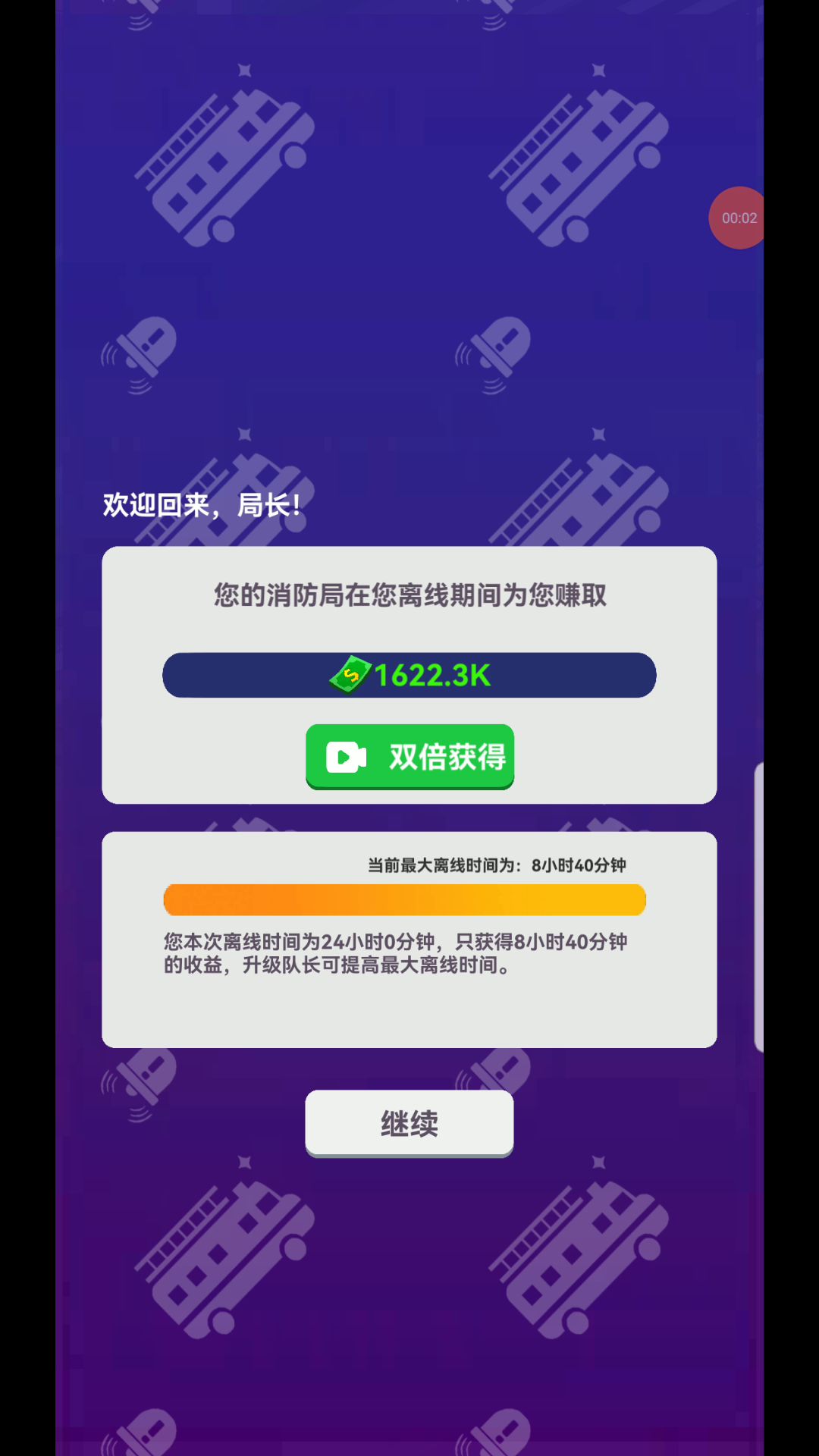 这游戏后面并没有做完,8小时1600K,十八十九级的消防车需要8万多K,勋章有一个bug,7个勋章的时候我看见45%的加成,满足8–16个勋章时,总加成是1%...