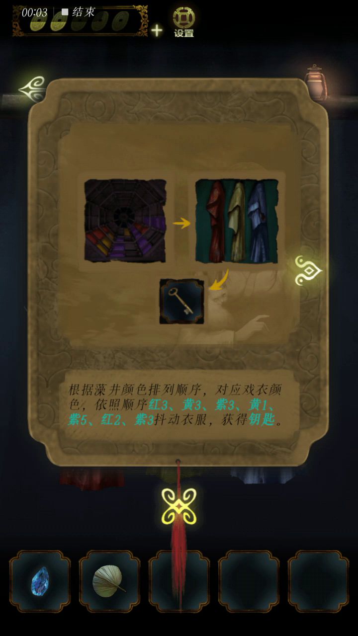 第一次的密码是红三次黄三次紫三次,第二次是黄一次,紫五次,红2次,紫三次,,戏台上面的井不看的话也不给你钥匙的