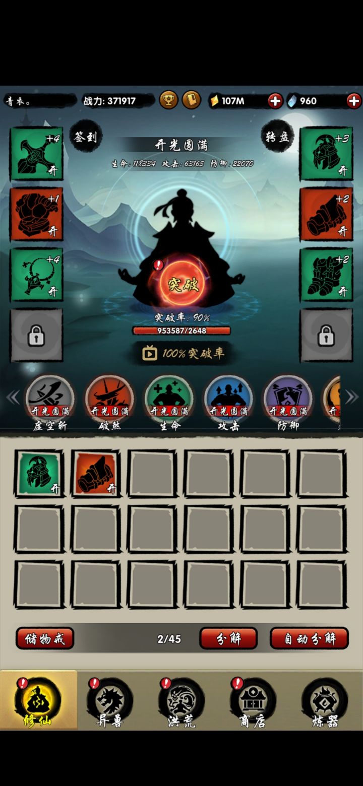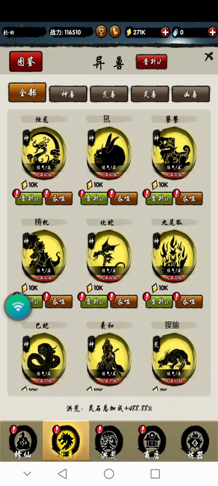 玩了两天了。首先这个游戏的最大缺点就是想要最大限度的获取资源就得刷广告。1.等级最好卡在开光圆满,把所有的技能提前解锁并点满到开光圆满。就不要再升级了。2.不停的积攒金币十连抽神兽,建议各类碎片都攒够1万再抽。凶兽碎片有几率抽出灵兽,灵兽有几率抽出凶兽,荒兽有几率抽出神兽。但我凶兽碎片基本上抽不出来荒兽和神兽。所以当凶兽灵兽收集齐了就可以用这两种碎片培养吞噬了,吞噬提升增加打怪灵石获得。3