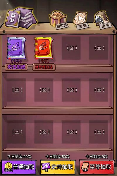 秘笈——秘笈的获取可消耗货币进行抽取秘笈分为:白色→蓝色→紫色→金色→红色抽取分为三个档次:普通抽取、史诗抽取、至尊抽取普通抽取:必得白色秘笈,几率得蓝色秘笈、紫色秘笈史诗抽取:必得紫色秘笈,几率得金色秘笈、红色秘笈至尊抽取:必得金色秘笈,高概率得红色秘笈秘笈的装备有等级限制,初始有7个装备栏。后续装备栏需要等级达到条件才会开启。装备相同的秘笈也会生效,并不冲突。秘笈升级——每升一