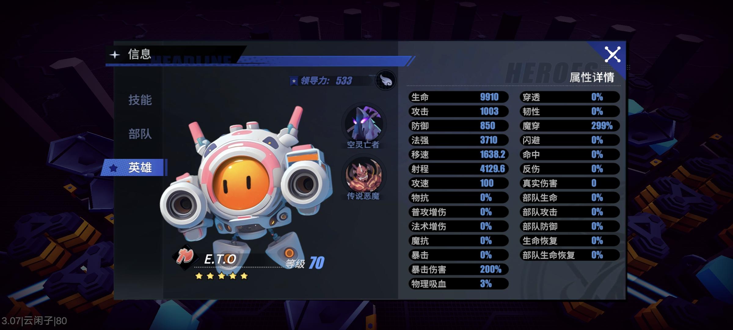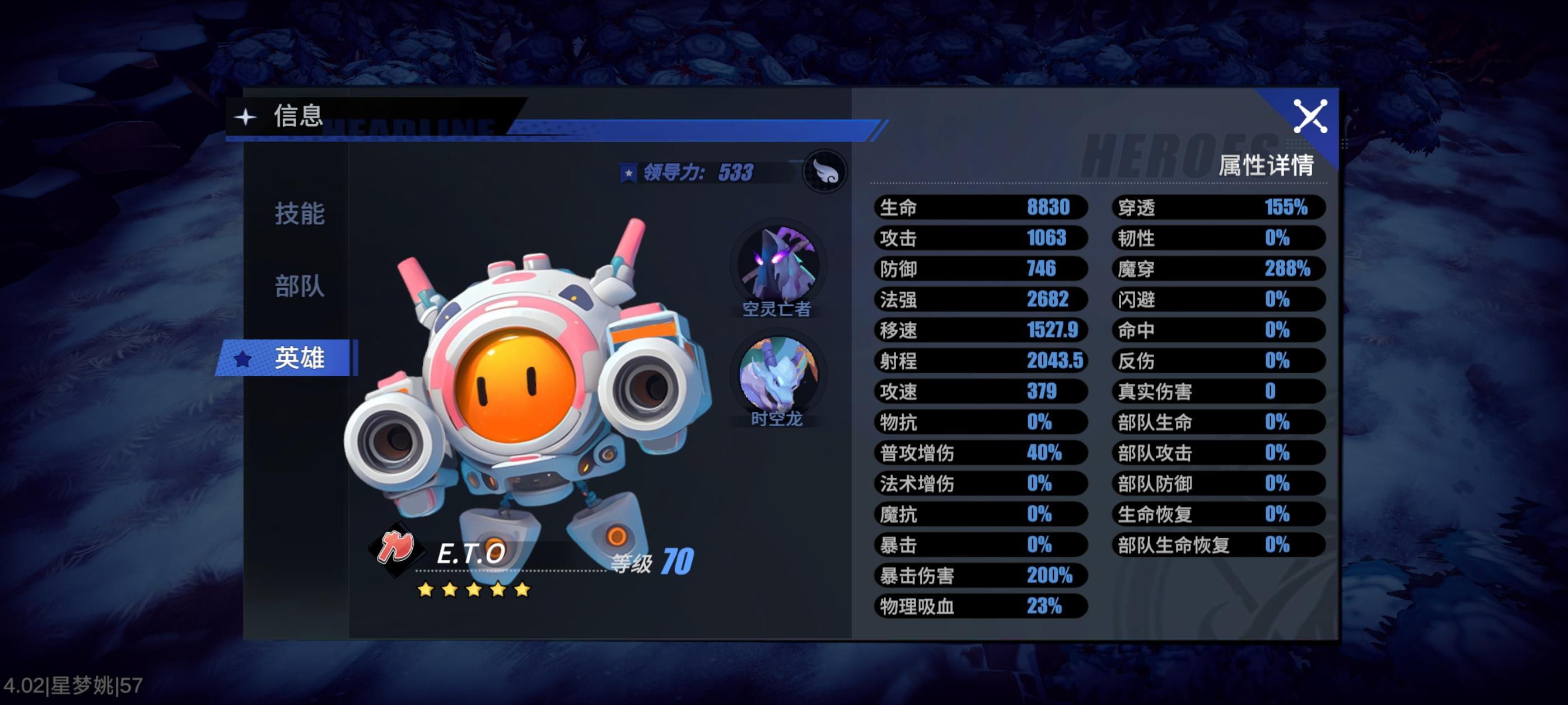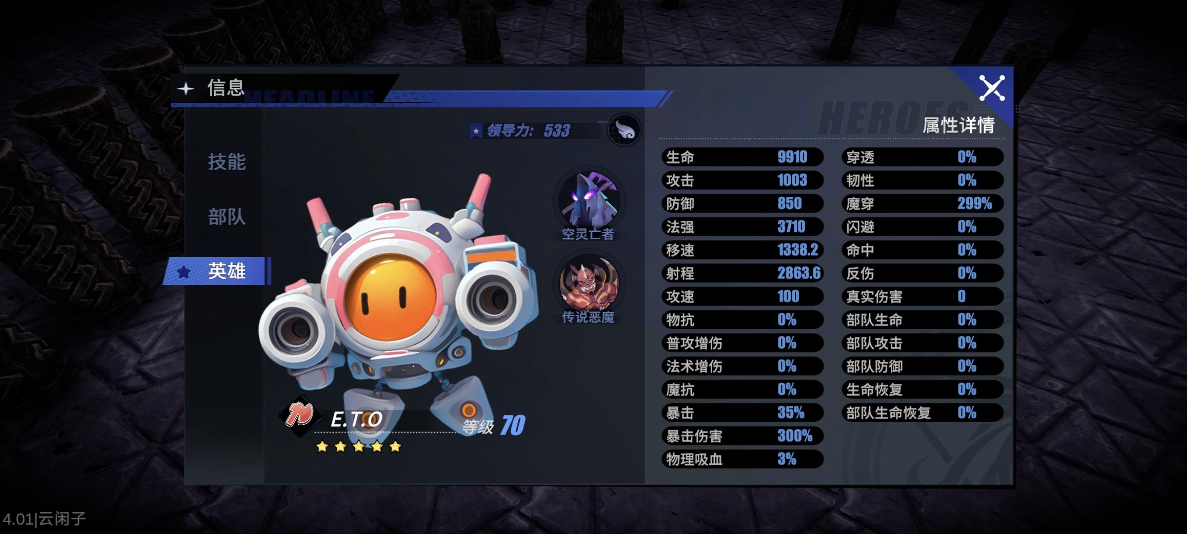 最新版新加的机械英雄非常强大,60级后不变身能射出七条射线(比变五头龙还多两个头)。。以下展示装备技能适用于神幻和无尽,两个副英雄也要配备相同程度的装备才能达到我所展示的面板。另外面板数据要在战斗场景中点左侧信息按钮,再点英雄按钮所见数据才是准确数据。英雄库换装界面的面板显示通常不准确。最后这个三千射程要主副英雄都装备射程鞋子,目前版本已无法取得射程鞋子,仅作展示,望周知。