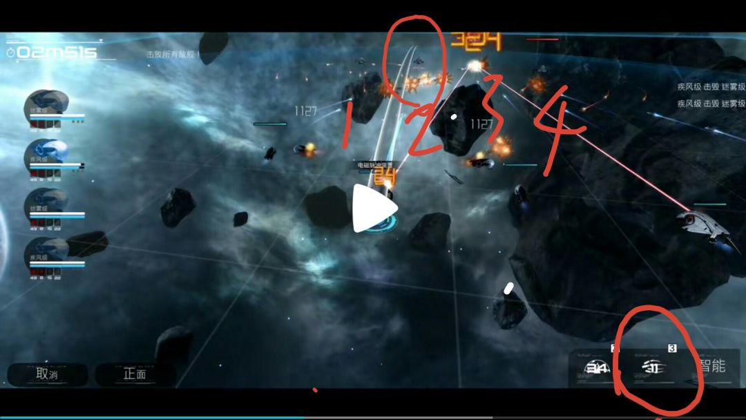 图片来自新宣传片 - 图中可以看到4个敌人,左右到右将它们编号为1、2、3、4,可以看到画面中播放键位置的船(被观察船)把目标锁定在编号2敌人身上,此时新一轮自动导弹准备发射中。 右下角是战术武器,可以看到战术导弹在读秒,所以正在发射的导弹是自动导弹。 - 第一图的被观察船的目标锁定依然在编号2敌人身上,此时新一轮自动导弹刚刚发射,可以看到新一轮自动导弹的攻击目标不是已锁定的编号2敌人,而是未锁定