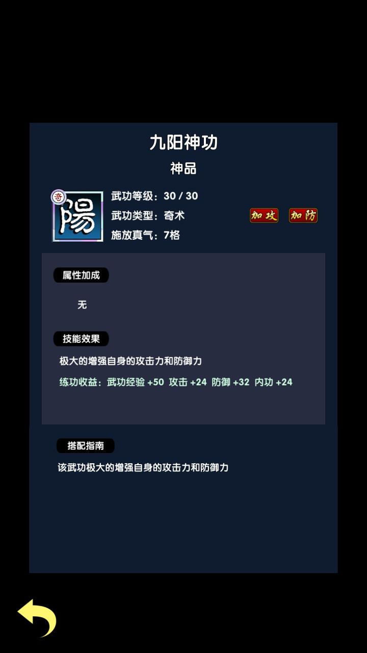 新手攻略开局会问三个问题,最后一问的第一个会得红色的辟邪剑法,第二个是红色的空手夺白刃,第三个是红色的虾米拳😂。推荐选第二个!个人喜欢虾米拳高爆发。武功:1.武功解锁条件可以去点武功界面查看,卡条件解锁武功!别浪费疲劳度。疲劳度很珍贵的!!!2.每个武功都会真气数,连击效果跟真气的大小有关,真气数大的放前面容易触发连击果,不过无相神功放在后面可以100%触发。易筋经和菩提心法则不能触发后续功