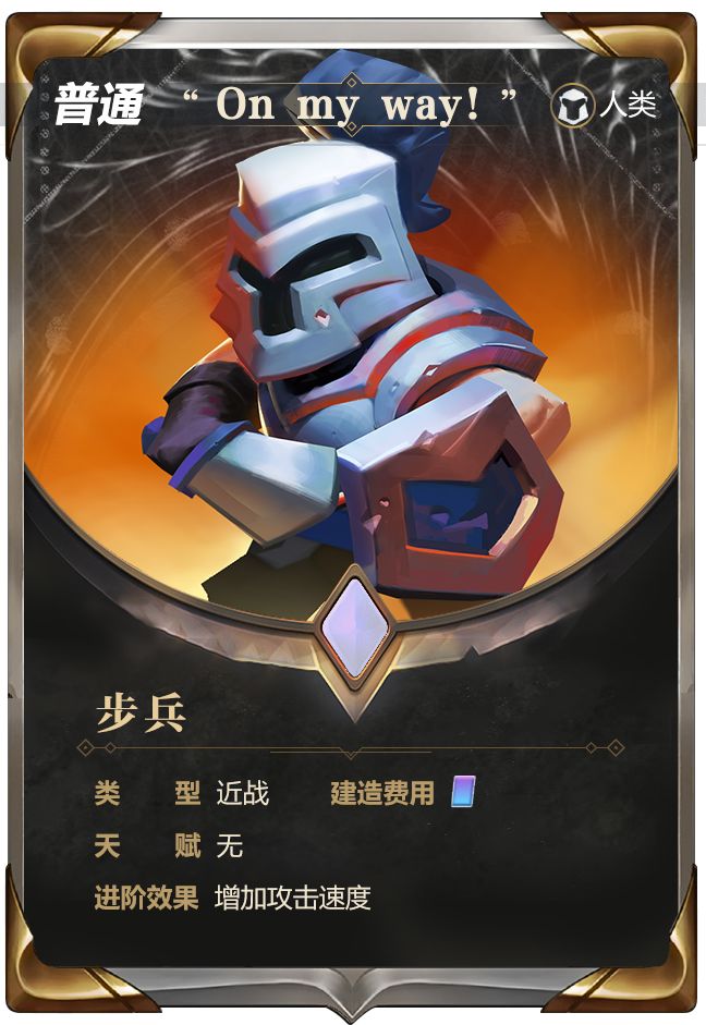 正所谓萝卜青菜各有所爱,经过了众多指挥官们一周的战斗,大家最青睐的战斗兵种究竟是谁呢?他就是——步兵!在前期所有的卡牌使用数量中,步兵毫无疑问的断层出道!让我们为步兵颁发这个荣誉奖项吧!【颁奖致词】作为“万金油”近战,他是一个丢上去不会错的选择;在低费爆兵流派中,他是不可或缺的一份子。1张卡牌的费用让指挥官们完全不会有负担。最前线的站位,可以为远程单位争取到宝贵的输出时间!让我们恭喜步兵