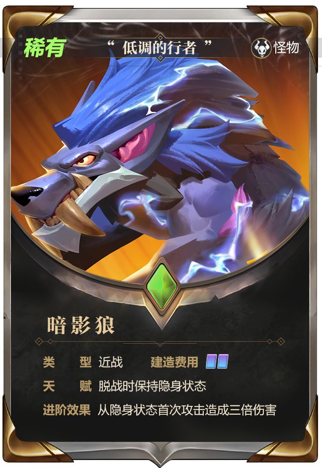《Project DF》的战场上,近战单位筑起防线,远程单位火力输出,飞行单位空中压制,三类兵种各司其职。然而有些单位就比较个性,在战场上也不走寻常路,让我们认识一下吧。低调的行者——暗影狼作为一个近战单位,理应冲锋在前,发动攻击的同时,也用自己的躯体拦截敌军。然而暗影狼可没这么热血,在没有进入战斗状态时,它会处于隐身状态,直到攻击范围内出现地方目标,它才会现身开始攻击。这种天赋最大的优势,就