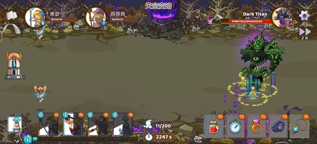 无尽的门户第三难度打法: 出战阵容和卡牌如下图,前排城墙挡住,然后慢慢砌个围栏,前期全都堆在城墙那一排,放满后再四周放箭塔和闪耀塔,中间扔德鲁伊,剑神,夜精灵,和治疗师,城墙最多砌三层,打破了慢慢补就行了,102波一会就打完了。 我用电脑打的,拍的图不是很清楚。