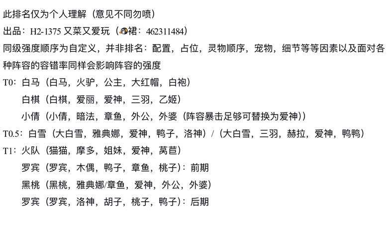 按照我觉得比较靠谱的分榜方式,分为三个榜单,输出榜,辅助榜和守卫榜。分榜方式主要侧重于PVP和泛用性这两方面。(因为是由我个人所列,总会有些个人偏向存在,觉得不合理的地方可以在评论区讨论,严禁引战,谢谢) 输出榜 T1 (强度完全可以支撑作为队伍的主核心) 梦境爱丽:(前期强度一般,觉醒后质变,70%的控制概率,能打出80%90%的效果,我们战区奥兹一二名加时赛,曾出现爱丽丝直接控对方全体翻盘) 缺