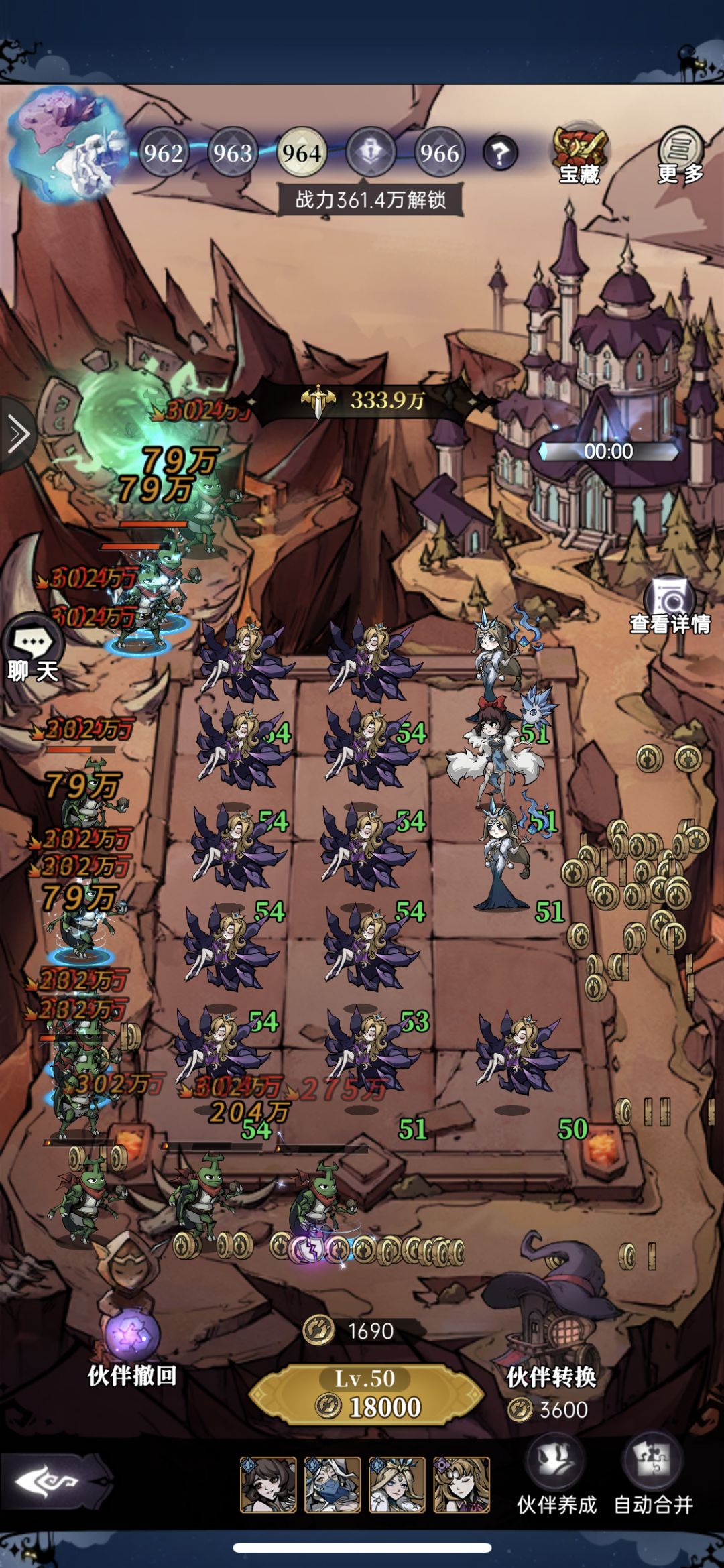 童话镇攻略 700关之前 小关卡,魔鸦群攻 + 莉丝减速,混搭少量布兰妮 Boss关,菲丽单秒 + 莉丝减速,混搭少量布兰妮 主力输出 > 菲丽/魔鸦一般都是保持10个左右(使用伙伴转换功能) 辅助输出 > 布兰妮2个左右,错开放,不要放同一行 辅助减速 > 莉丝2~3个,错开放,不要放同一行 重点技巧 1、莉丝减速天赋优先升10级,可以攻击2个敌人;接下来升魔鸦攻速天赋,10级攻击3个目标,20