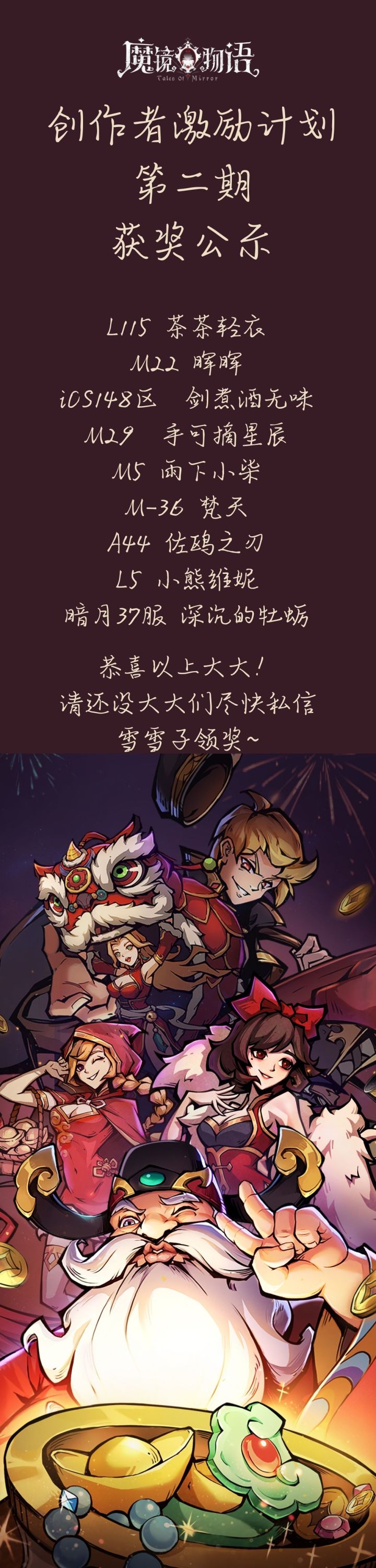 叮咚 公示时间到本次创作者激励计划圆满结束!!雪雪子收到了一百五十多篇投稿感受到了大大们满满的创作热情,大家都非常的给力(๑•̀ㅂ•́)و✧恭喜以下大大们获得【魔镜懂王】称号,高能晶石*50,钻石*1000奖励!梦境大大们可以直接前往邮件中领取哦~没有抽中的梦境大大们也不要灰心!下一期的活动等你来呀!(づ ̄3 ̄)づ╭❤以下为活动原文:亲爱的梦境大大们大家好呀,这里是雪雪子~今天雪
