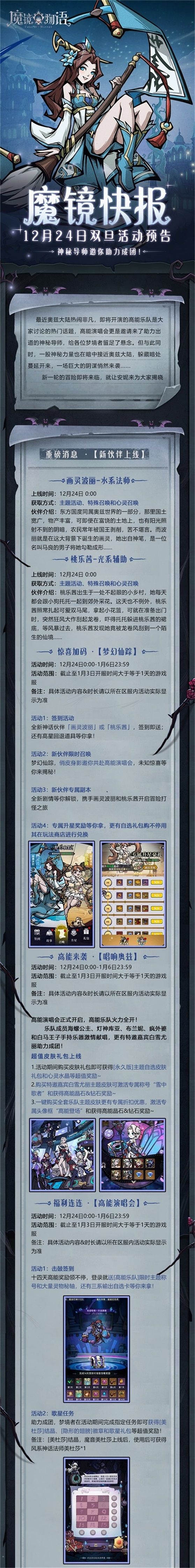 亲爱的梦境大大们大家好,这里是雪雪子!(〃'▽'〃)为了给各位梦境者带来更优质的游戏体验,服务器将于2021年12月23日14:30-17:30进行版本更新维护,更新期间将无法登录游戏,视进度可能会提前或延后开服。请各位梦境者耐心等候,更新完成后,安妮会为大家送上心意补偿,请及时领取哦~接下来就是大家最期待的版本资讯啦★ 12月24日0点 开启『高能演唱会』主题活动『魔音降临』与全新玩法★