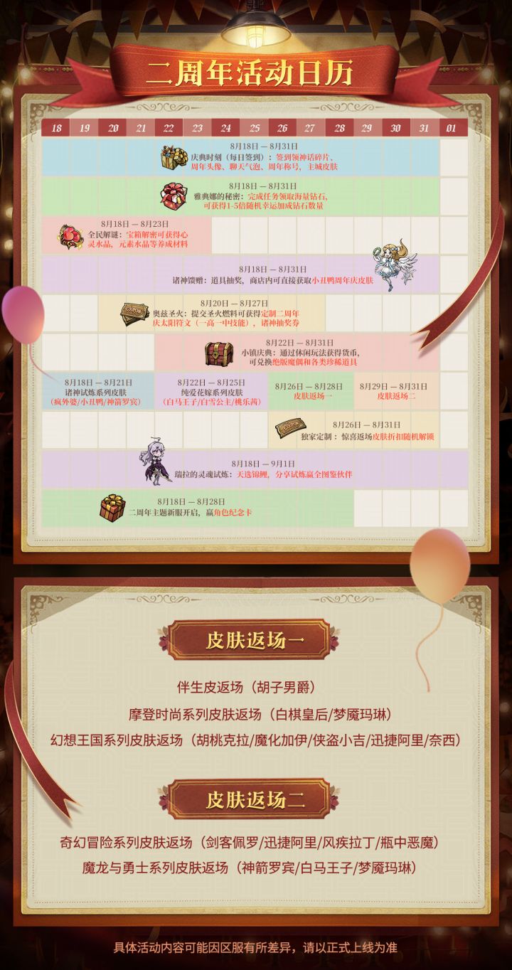 图解周年庆典,超全时间线一览送上!十大活动,新玩法,新福利,新体验,一起狂欢二周年福利满满,绝版魔偶[大白],限定皮肤等超多可免费获取福利