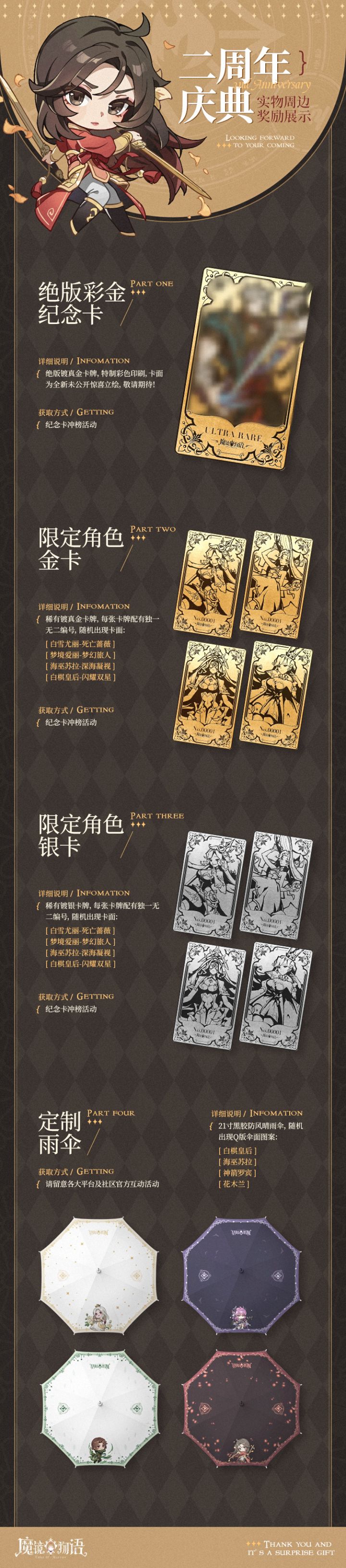 梦境大大们中午好,这里是雪雪子!本次周年庆定制实物周边大公开镀金角色纪念彩金卡/金卡/银卡,收藏价值拉满Q版立绘黑胶晴雨伞,不管是晴天雨天,都有伙伴们陪伴详情请见下图PS:金卡均具有相关珠宝证书噢二周年庆福利活动已开启,梦境大大们可以点击下方链接留言,将有机会获得定制雨伞