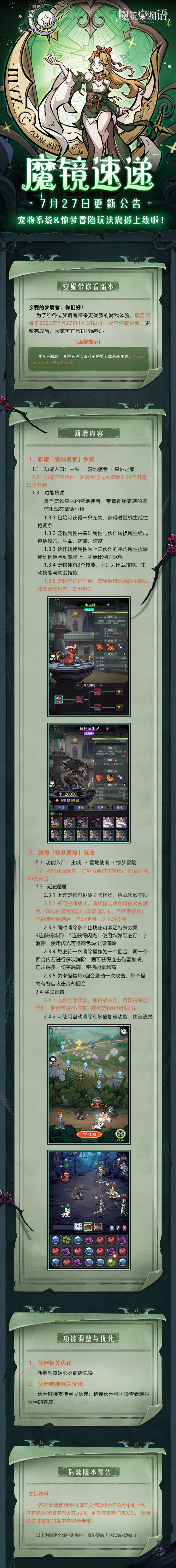 亲爱的梦境大大们上午好!这里是雪雪子!为了给各位梦境者带来更优质的游戏体验,服务器将于2023年7月27日 14:30进行一次不停服更新,更新完成后,大家可正常进行游戏~猛宠来袭,惊梦冒险,奥兹大战一触即发☘新增来自宠物森林「营地使者」系统,属性战力双提升☘新增「惊梦冒险」玩法,上阵宠物可挑战关卡怪物获得宠物经验和本体详情请见下图由于TapTap平台会压缩长图,点击长图浏览更清晰噢