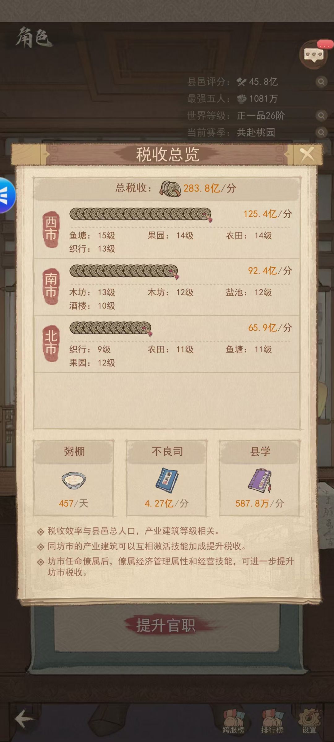 城关等级(核心!) 效果: 每2级提升5%总税收(如26级城关=65%加成)。 操作: 优先升级城关,资源倾斜保障。 以武会友(章节奖励) 效果: 通关每章最后一关,解锁2%永久税收加成。 操作: 每日推进,战力达标后立刻通关拿奖励。 基础课业(政策必点) 效果: 基础政策点满:全坊市+5%税收 租庸调法解锁:全坊市+15%税收 + 开放南北市第3僚属位 操作: 开服首周点满(参考课业攻略优先级)